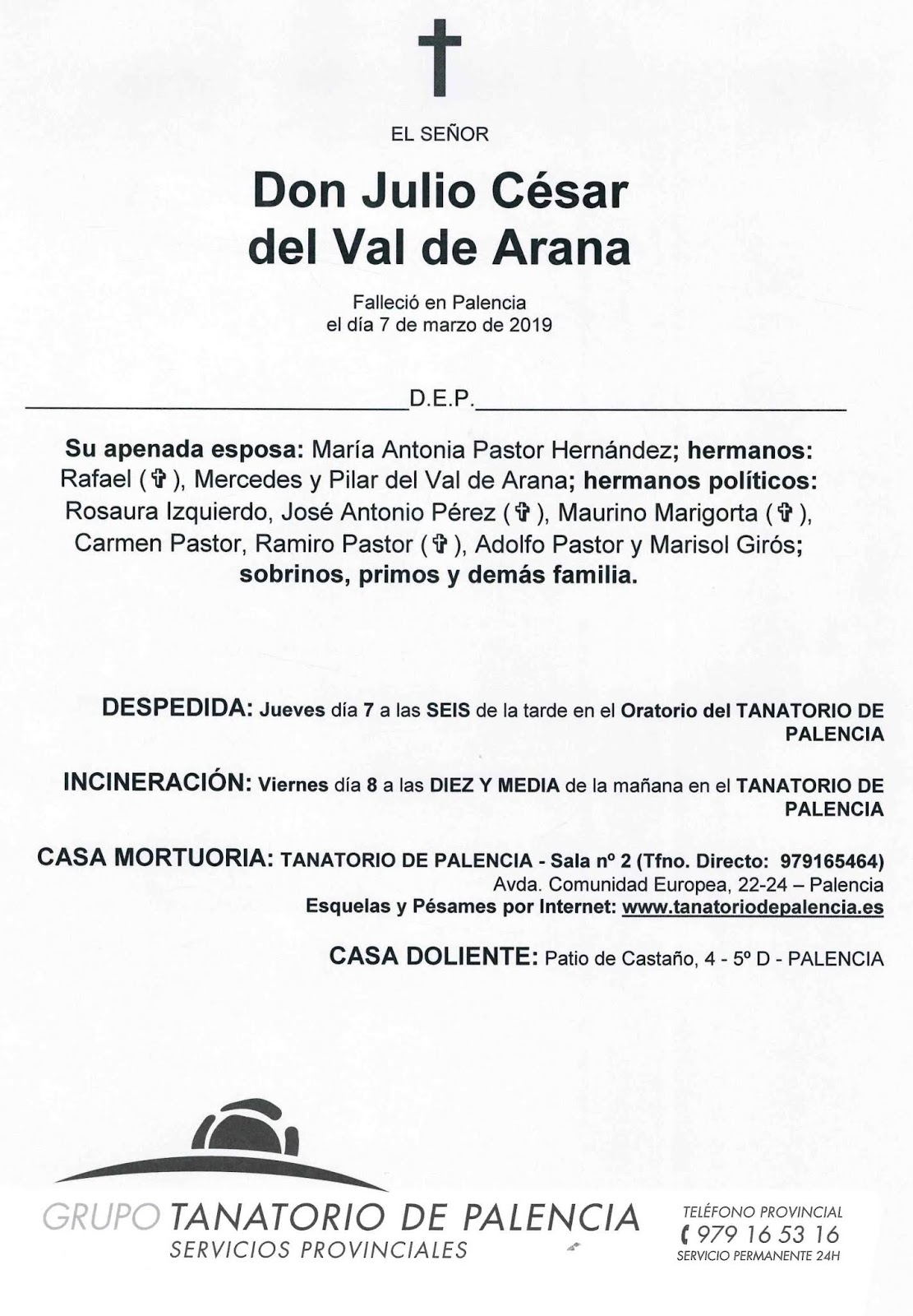 marzo 8, 2019 1111 × 1600 FALLECIMIENTO DE JULIO DEL VAL DE ARANA